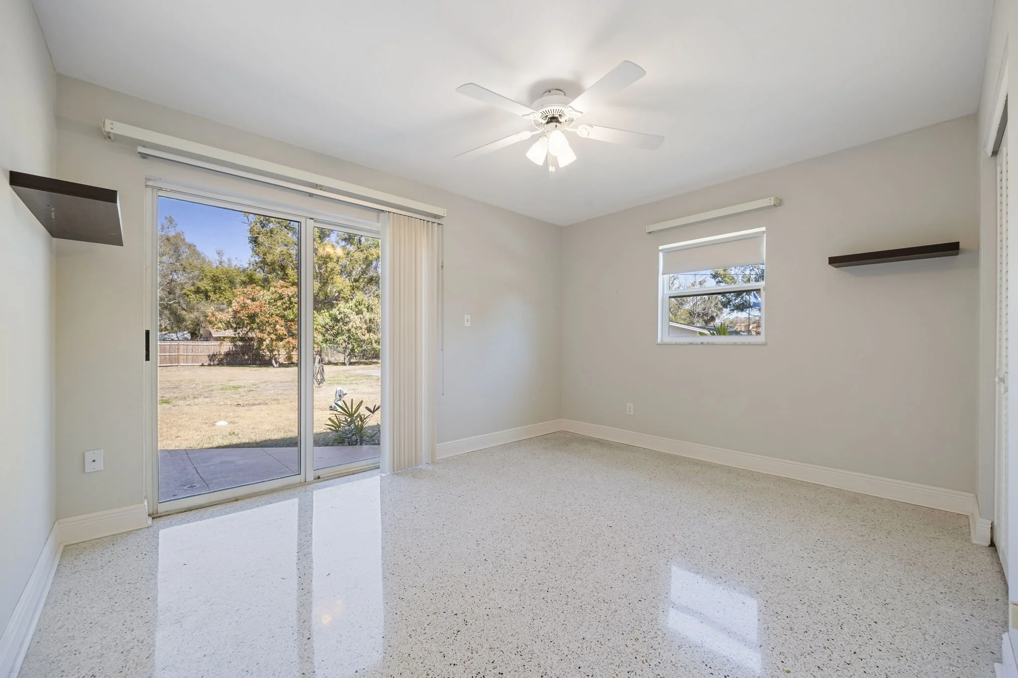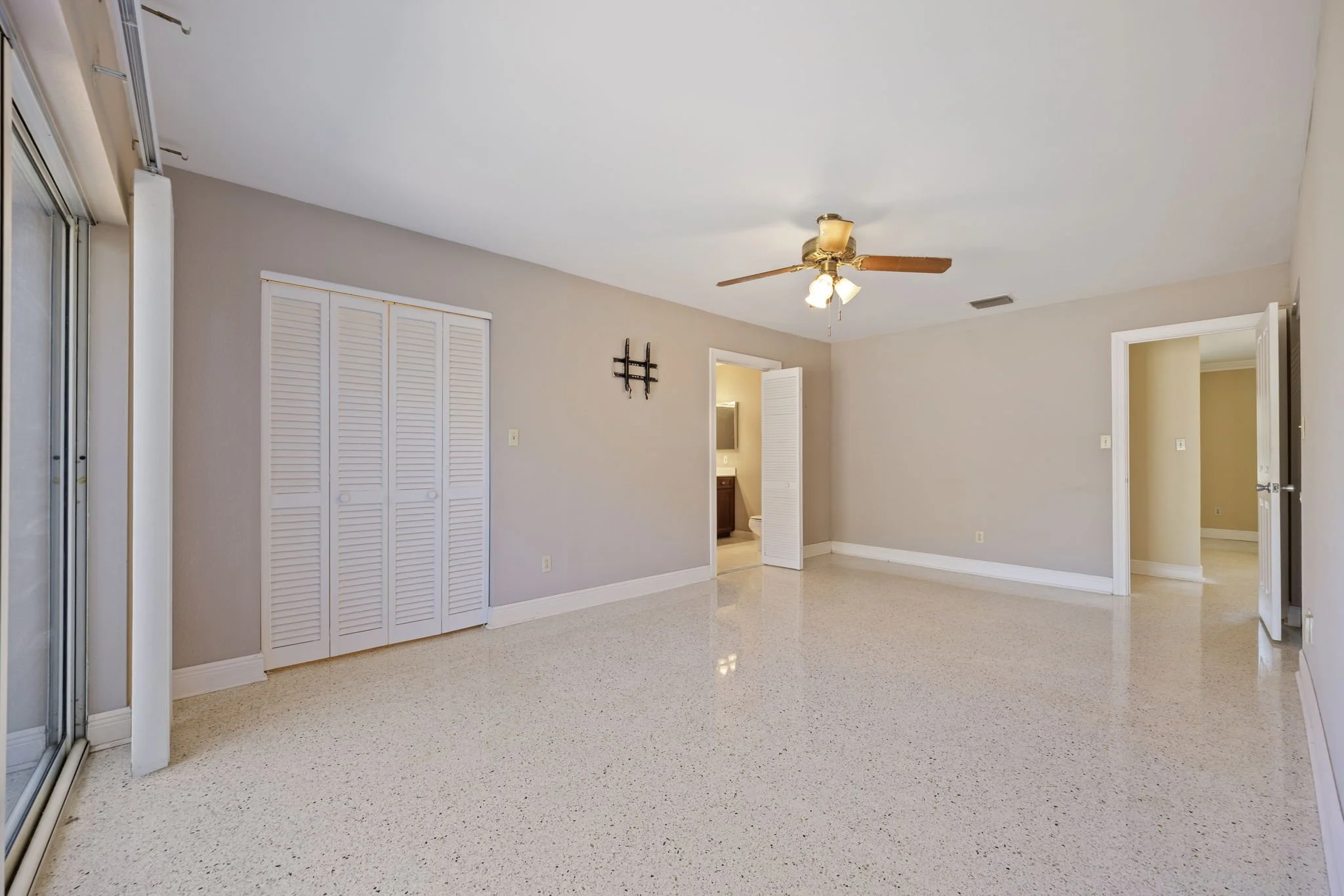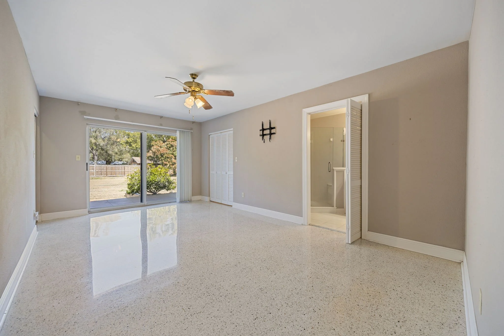 Primary suite with three closets and sliding doors to backyard